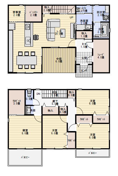 今回のプランは41坪4LDKの中庭のある間取りになります。