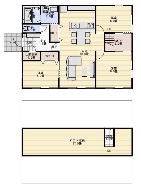 そしてこの平屋の間取りの特徴はロフト収納が17畳と